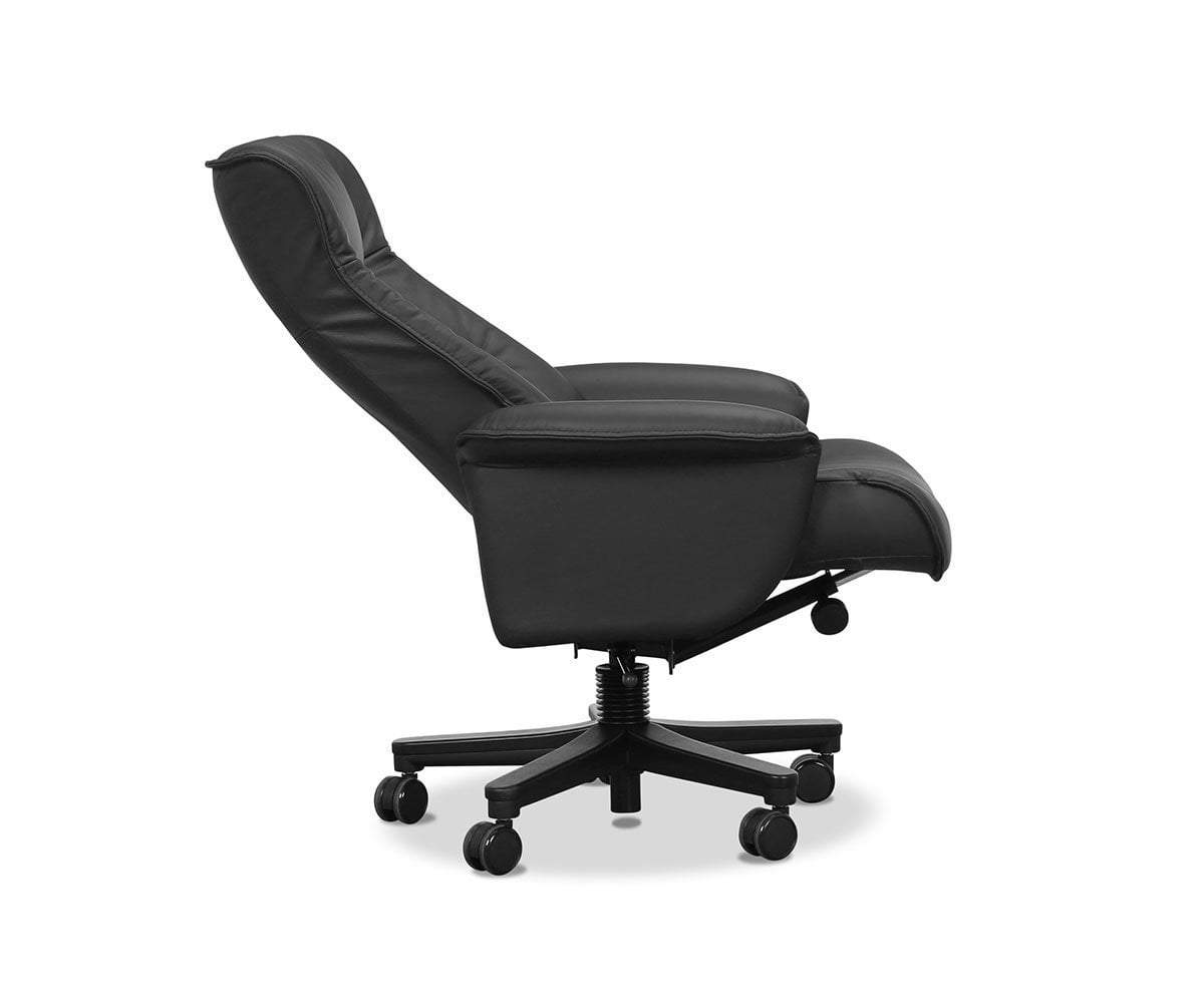 Reap the benefits of a living room recliner in your streamlined Aatos reclining office chair. Designed to cradle you in comfort, it features a padded seat, back and armrests, wrapped in leather upholstery. This must-have office staple will lure you to your desk, provide support while tackling your tasks and allow you to recline for a refreshing stretch, brainstorm session or nap. The four leg base offers stability, while the castors and 360 degree swivel give you mobility. Adjust the seat height to the level best for you, sit or lean back enjoy your workspace.