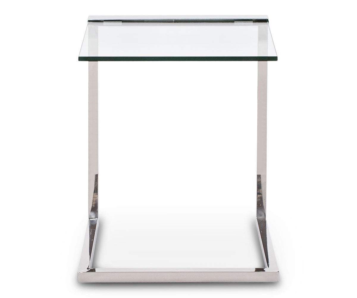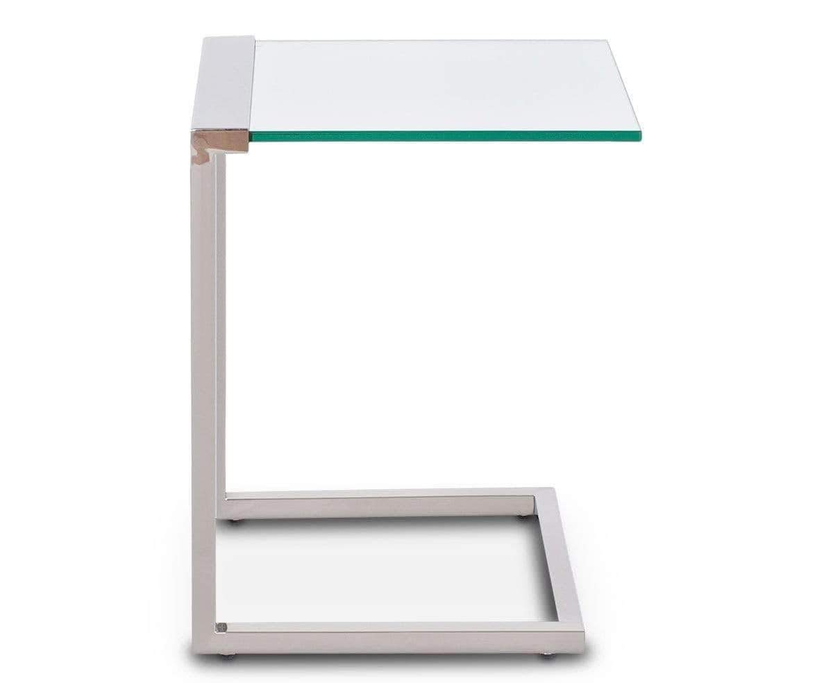 Balance out heavy furniture with the Adanso end table. This light and airy design is crafted with a reflective stainless-steel frame and sturdy tempered glass top.