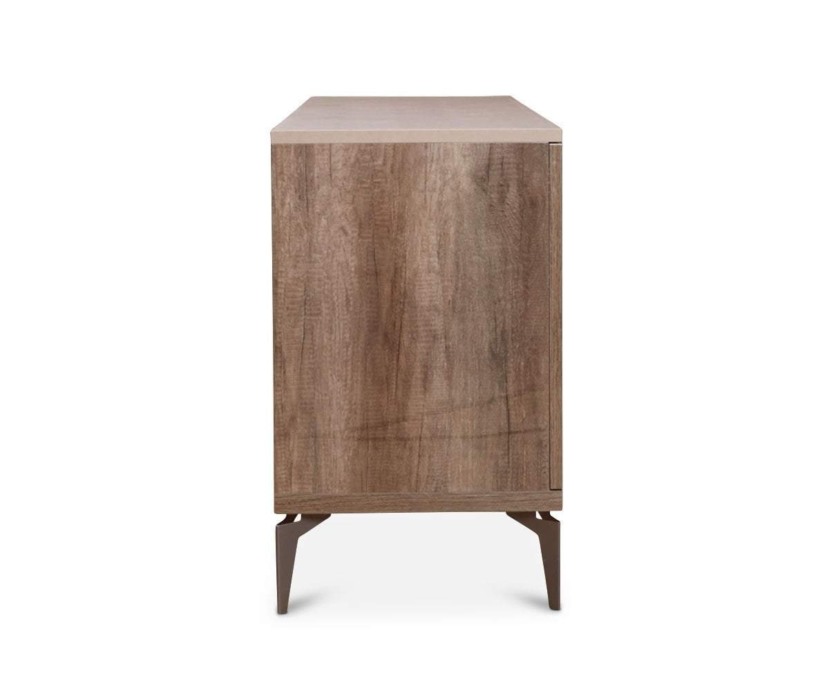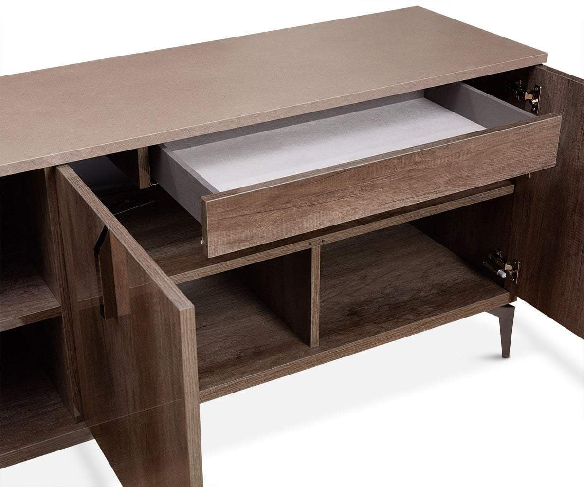 Made in Italy, the Akana sideboard brings a bounty of storage to your dining room. Natural warmth comes from the striking wood grain pattern enhanced by the high gloss finish and intriguing metal accents. Three doors open to reveal five spacious compartments and one drawer. Organize your table decor, glassware, serving dishes and more in a stylish statement piece for your dining area.