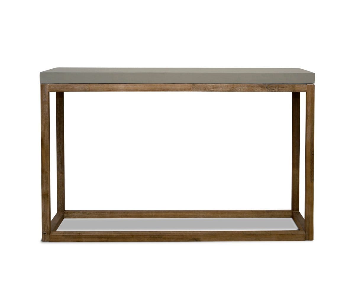 Your go-to solution for indoor or outdoor use? The Armon console table. The base is solid acacia, renowned for its distinctive, swirling grain. The tabletop is crafted with ultra durable material in a natural cement finish for a look that's both modern and timeless.