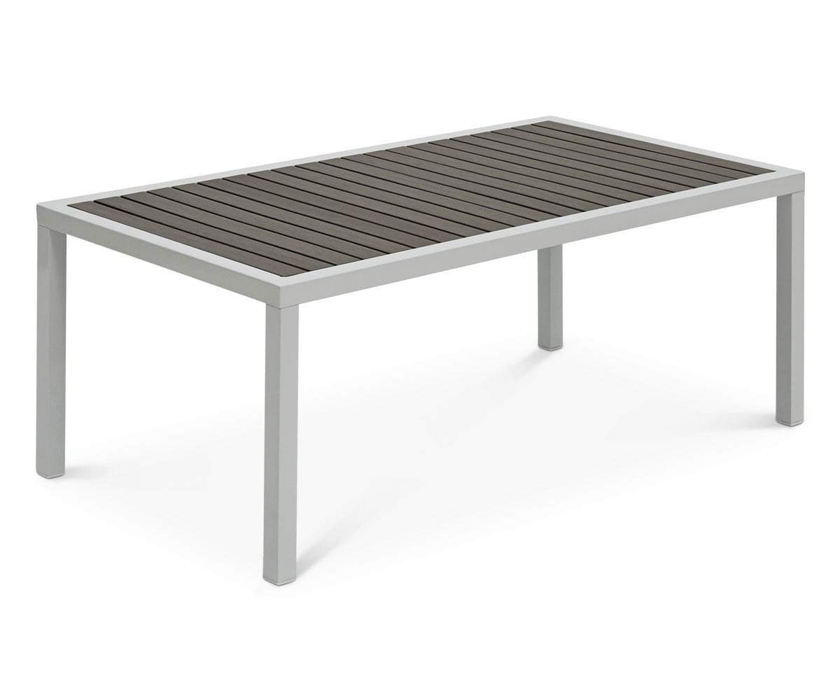 Modern in design, the Aurora coffee table is an attractive surface to place your refreshments, appetizers, plants, or decorative items. Featuring a white powder-coated aluminum frame with tabletop of resin wood slats, it is both durable and lightweight for enjoyment season after season.