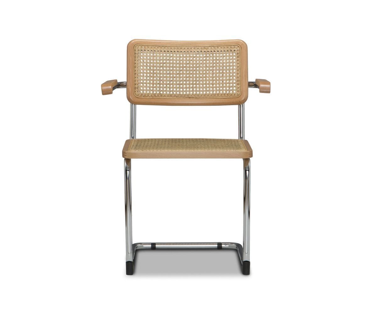 With an unmistakable mid-century look, the Bendt armchair masterfully combines elements to create an appealing addition to your dining room. The distinctive design features a cane seat and backrest bordered in solid European beech wood which are secured to the cantilevered metal frame finished in polished chrome. Armrests made of the same materials wrap around to allow for a comfortable resting position making mealtime, quality time.
