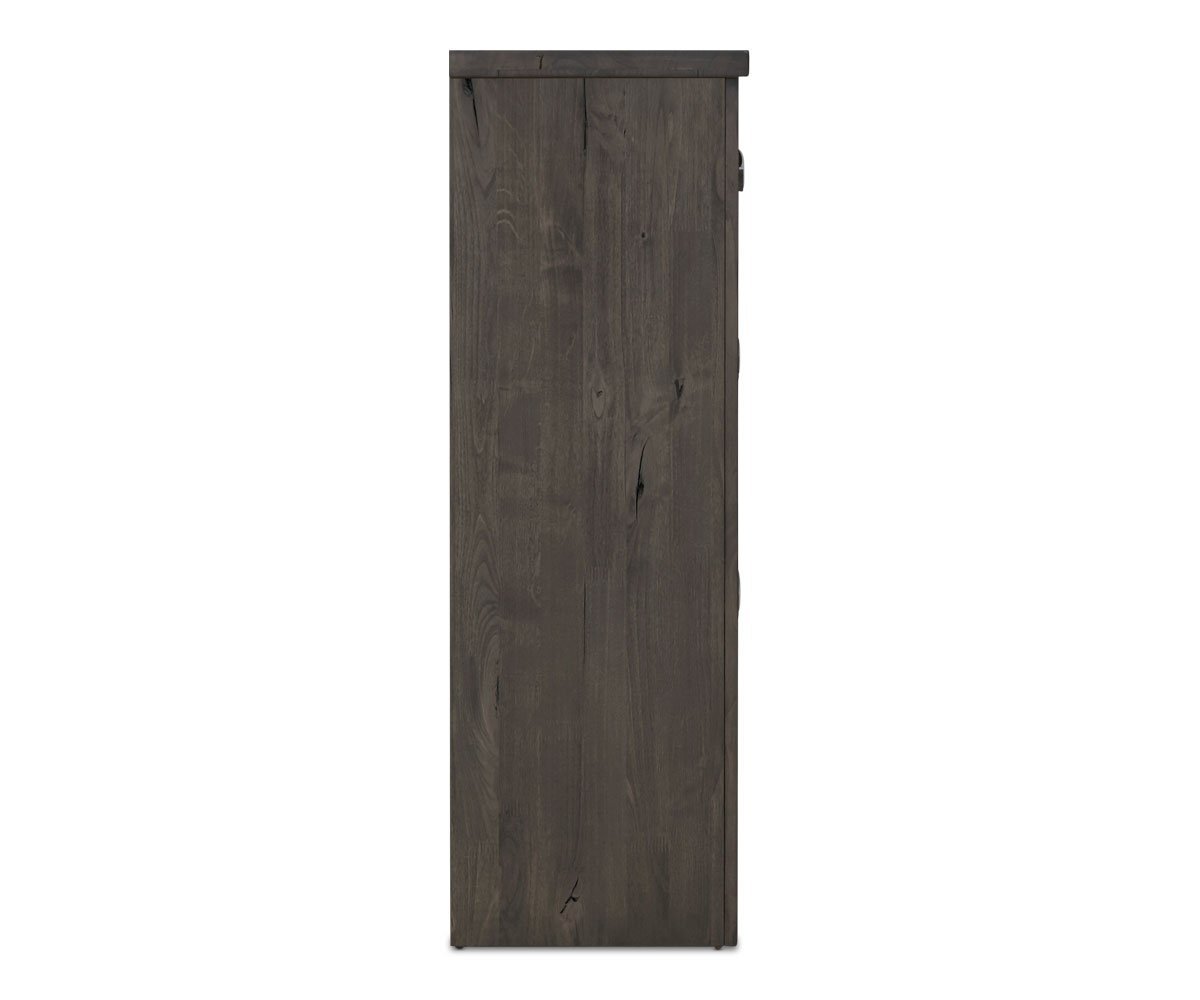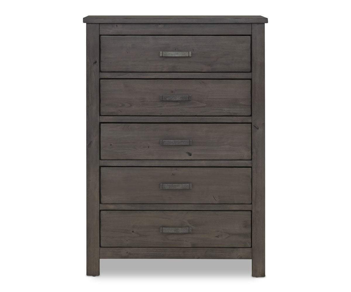 The Carter high chest offers five large storage drawers to help organize your bedroom. Finished with a grey stain and constructed of solid American alder wood, this modern-meets-rustic design pairs perfectly with many decor styles.