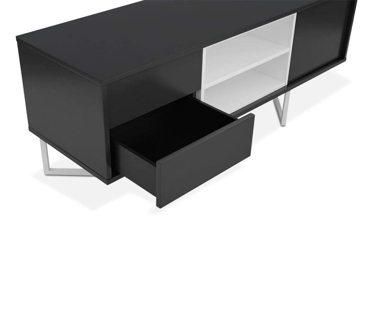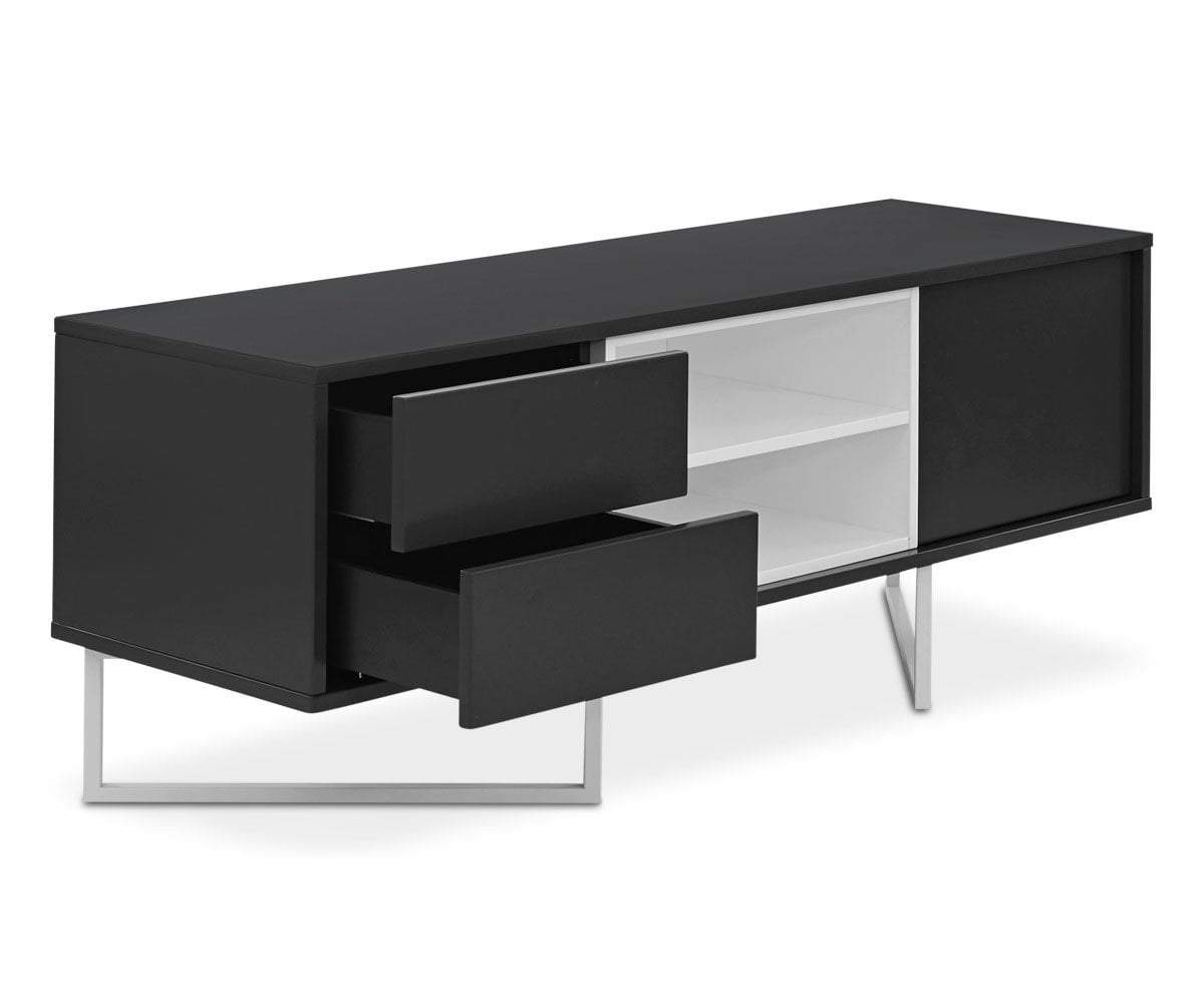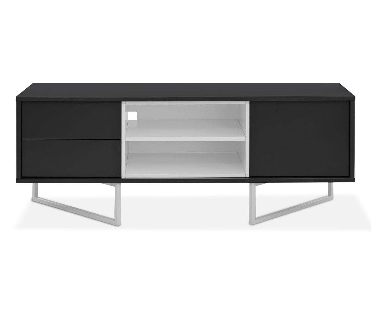 A series of rectangles and squares make the Conner media stand a geometric masterpiece for your living or entertaining space. Two drawers one large cabinet with double doors flank the open shelf space to provide an ample variety of storage and display options. Stow remotes and miscellaneous items out of sight, while displaying game consoles, magazines or collectibles in clear view. Set on top of sturdy iron legs set at intriguing angles, this media stand makes a bold, modern statement in your room.