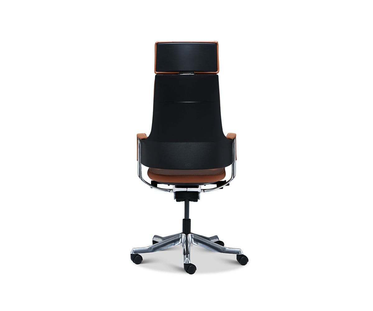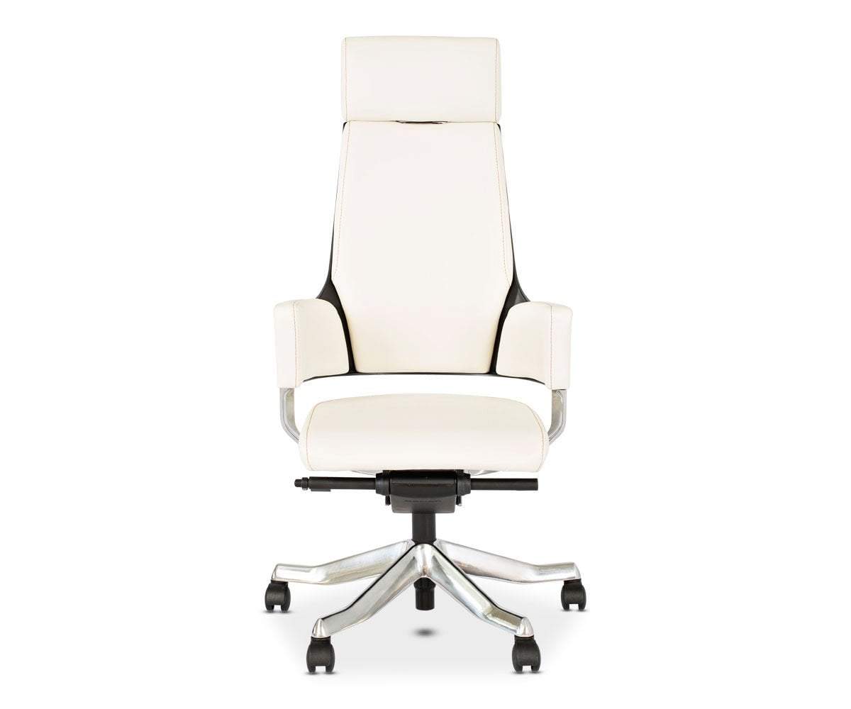 The Delphi leather desk chair is a futuristic design with comfort in mind. Featuring a high-back and wrapped armrests, this leather-upholstered chair makes a strong statement.