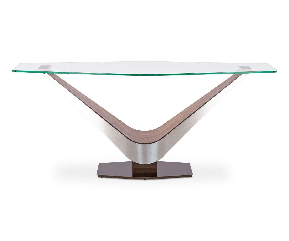 The Dermae console table features an alluring profile. The sculptural base crafted from brushed stainless steel with a walnut inlay is capped with an elegant glass top.