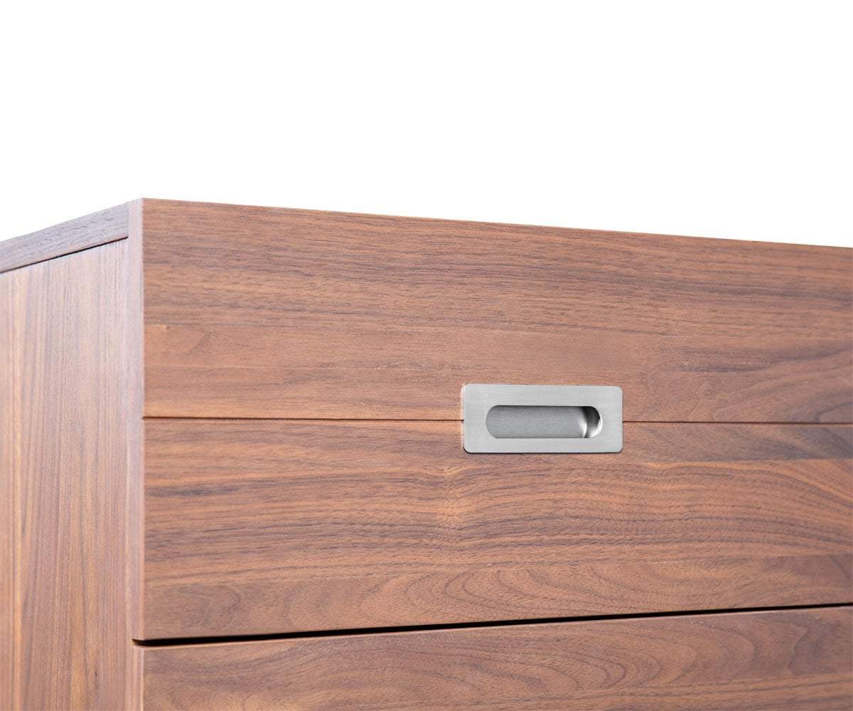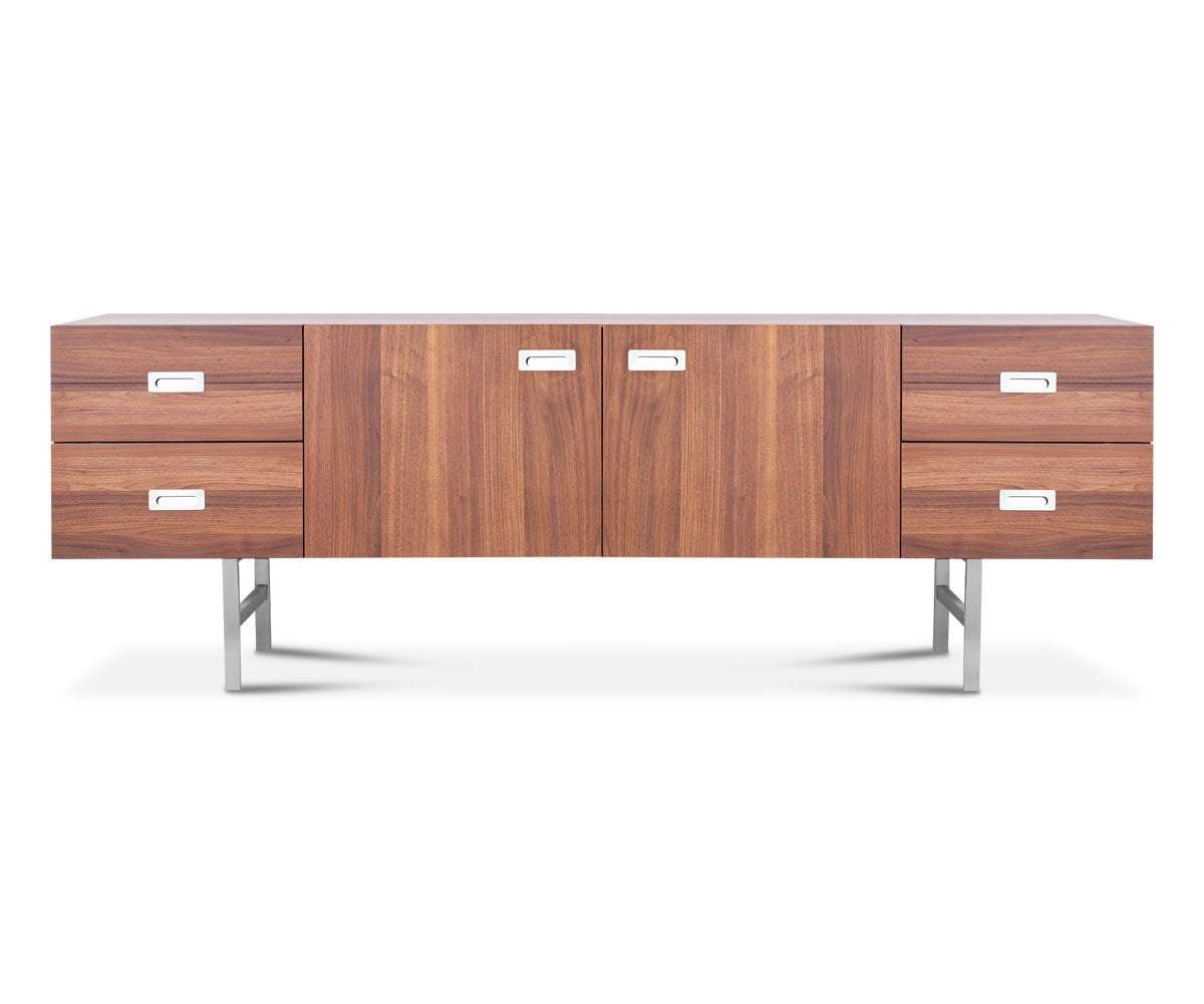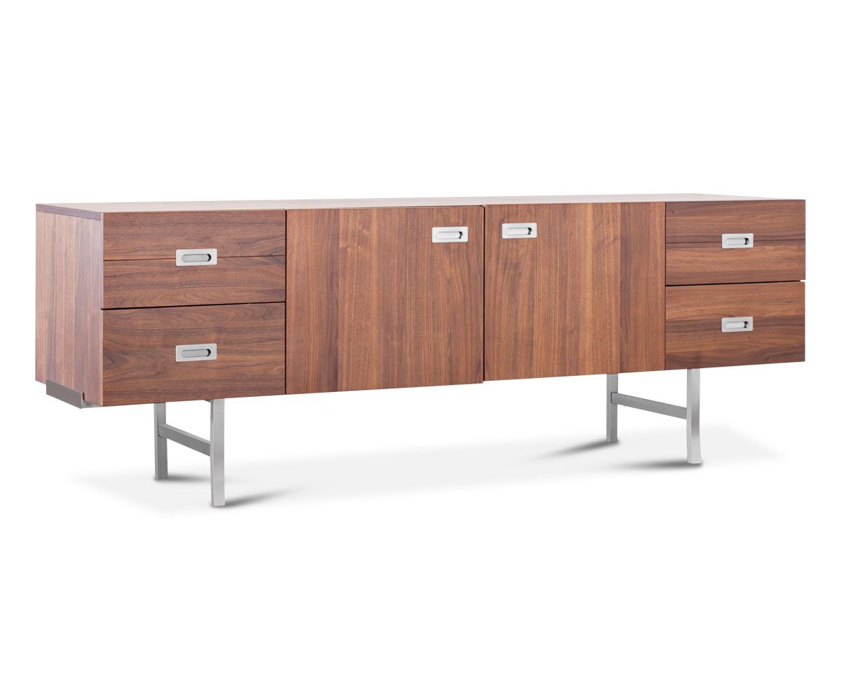 The Dissone media stand makes the ultimate entertainment organizer. This rustic industrial piece is crafted from poplar wood and brushed stainless steel. The dynamic design boasts four large drawers with smooth-glide tracks and two open cabinets.