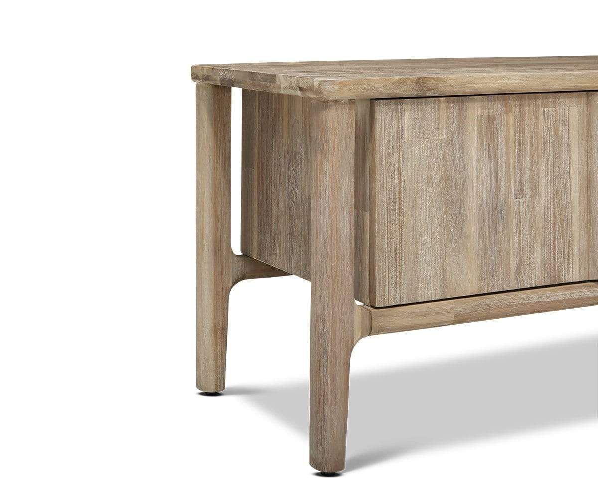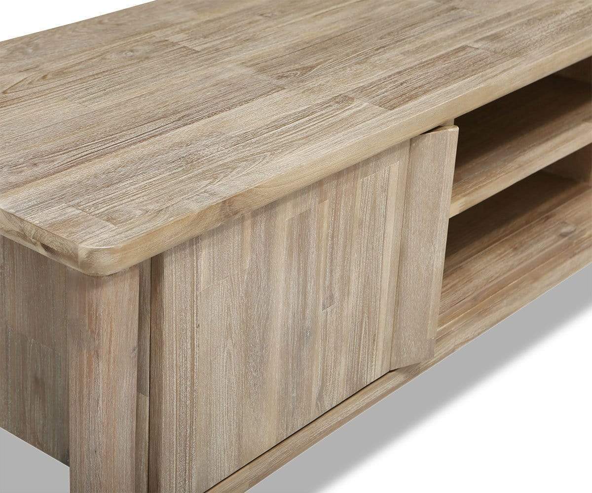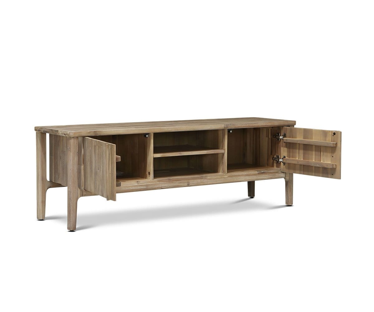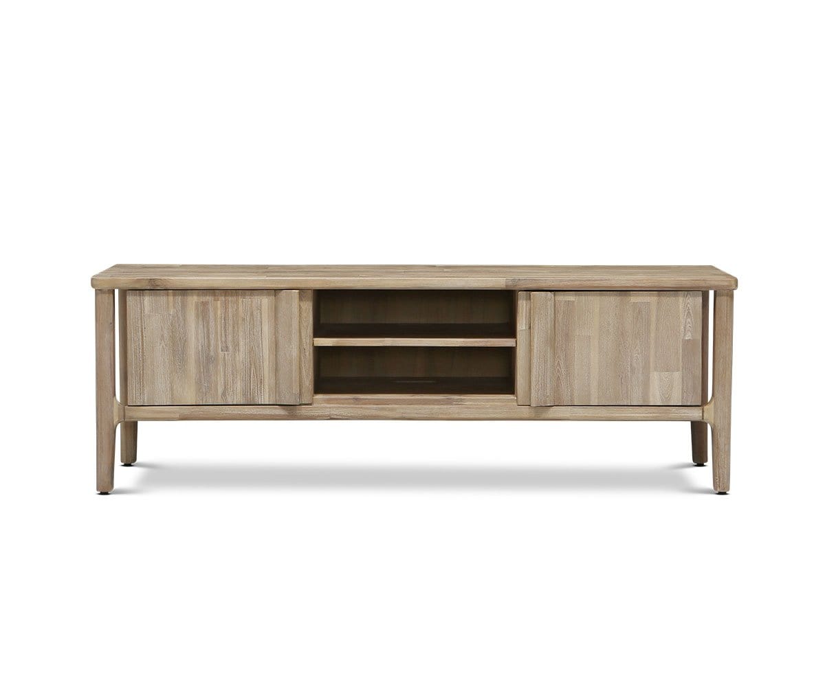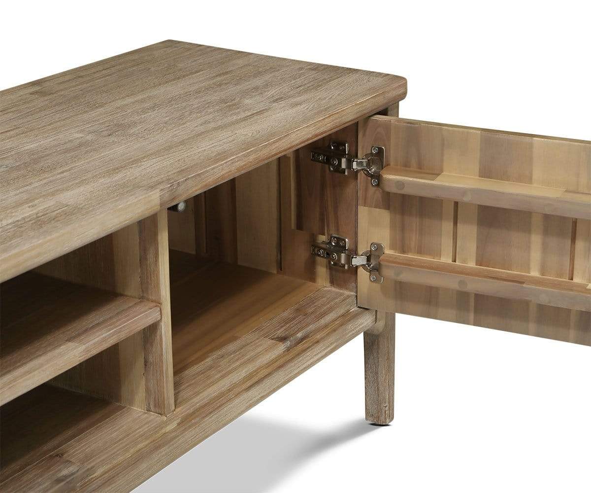 The Eckler media stand evokes both rustic charm and contemporary elegance, thanks to a combination of rounded edges, minimal lines and a unique grey stain that accentuates the swirling grain of acacia wood. This piece comes with plenty of storage for electronics and other living room essentials.