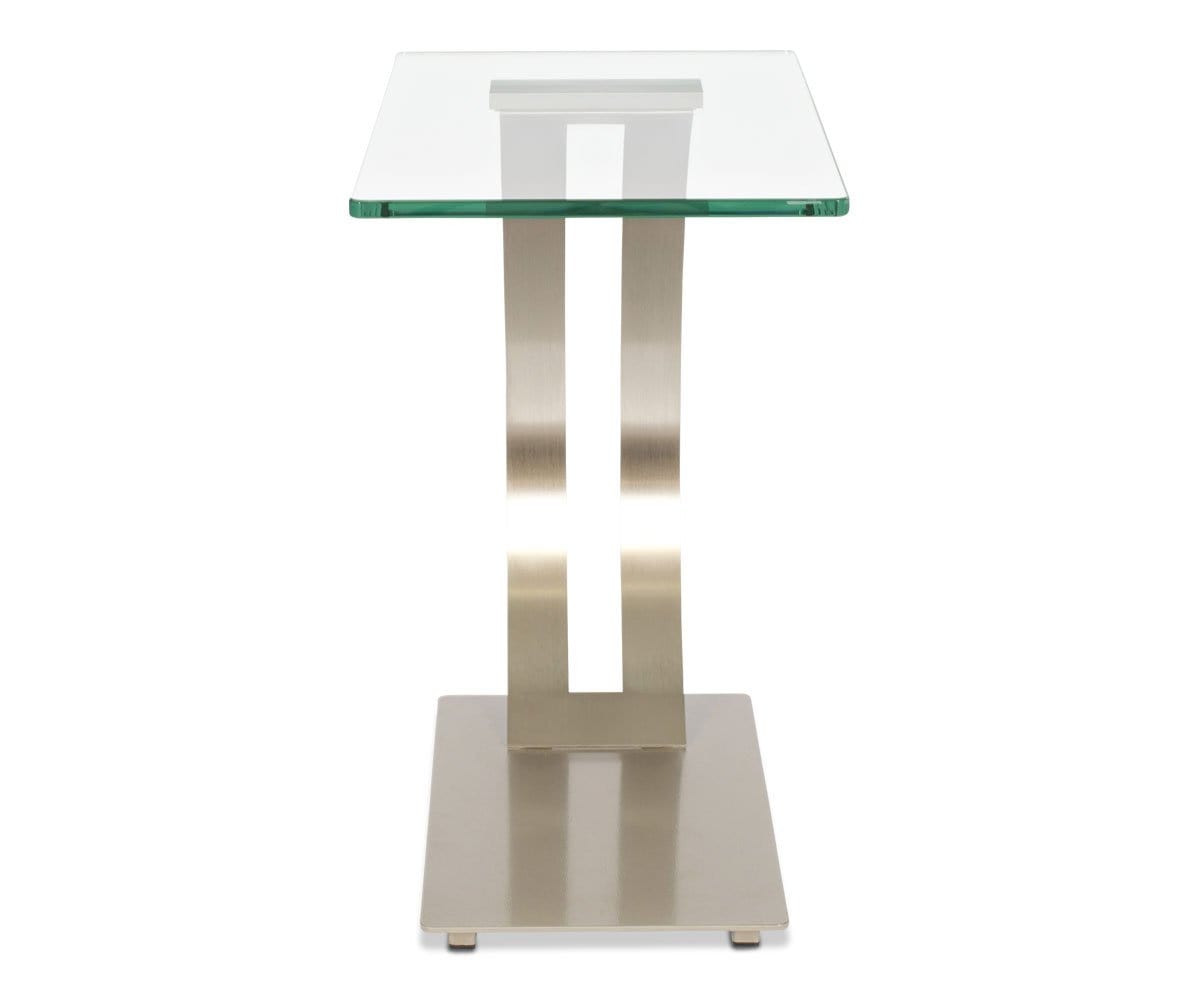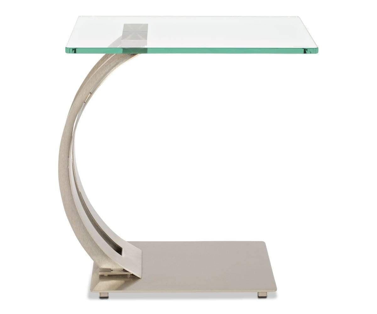 Bring dimension to any space, big or small, with the Encore accent table. Made in the USA, it features gleaming champagne-plated steel base and arcs supporting the ½” thick clear, tempered glass top. Strong enough to hold your laptop computer, this sculptural beauty adds sophistication wherever you place it.