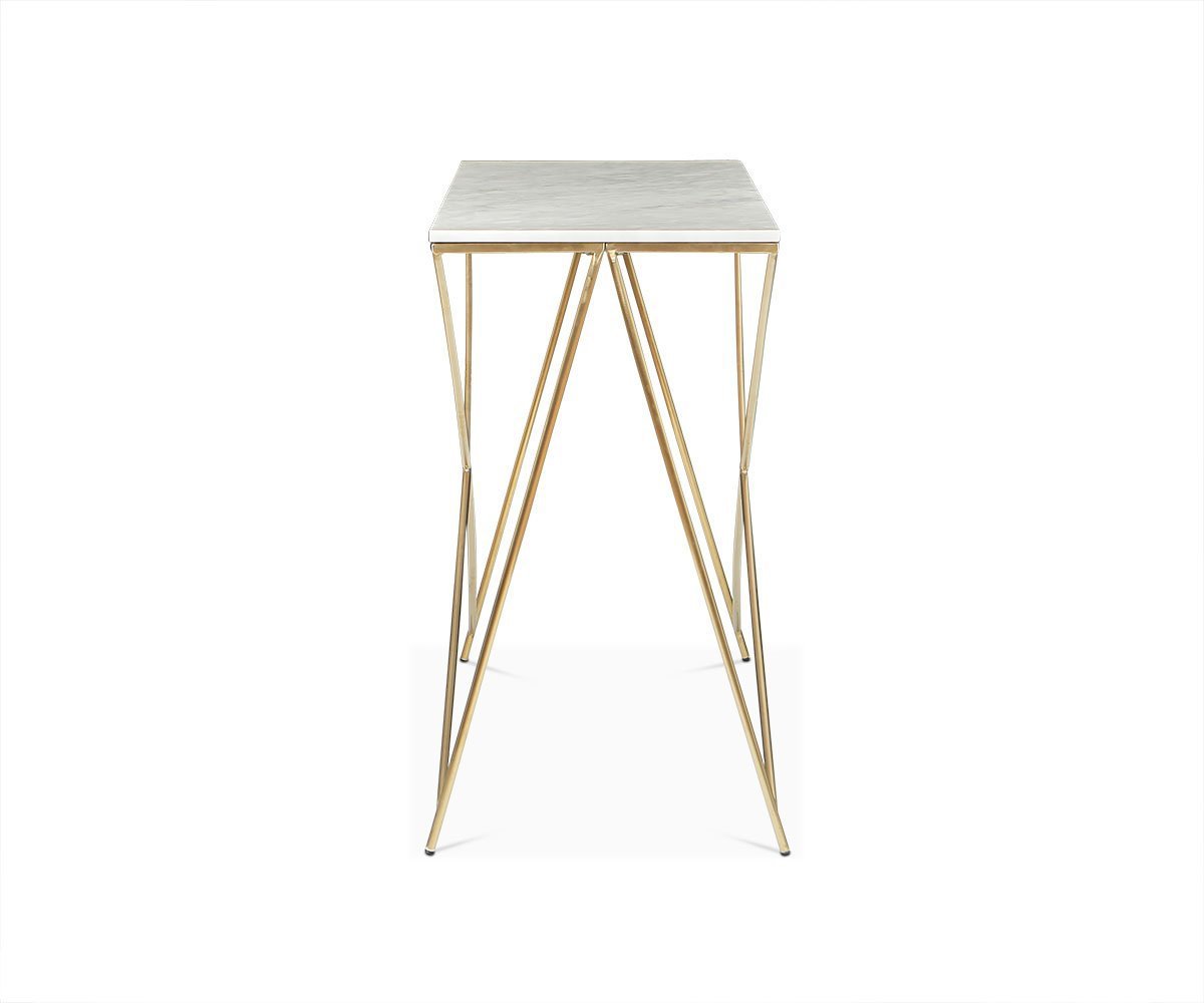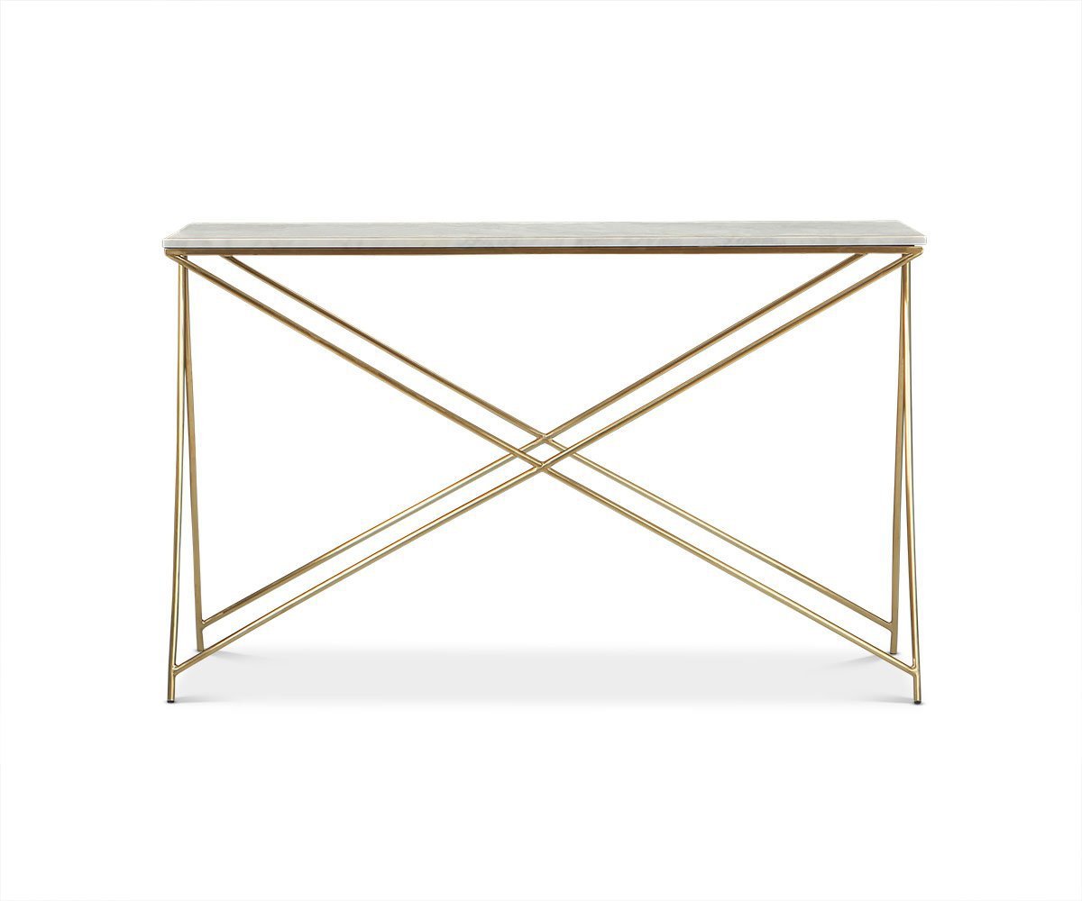 A contemporary geometric wonder, the Finna console table combines intriguing design with timeless materials. The smooth marble top rests securely on its metal frame and legs, set at angles. This artistic approach provides a different pattern depending on your vantage point. Place behind your sofa or along a wall to establish more surface area for lamps, magazines, baskets, vases and the like.
