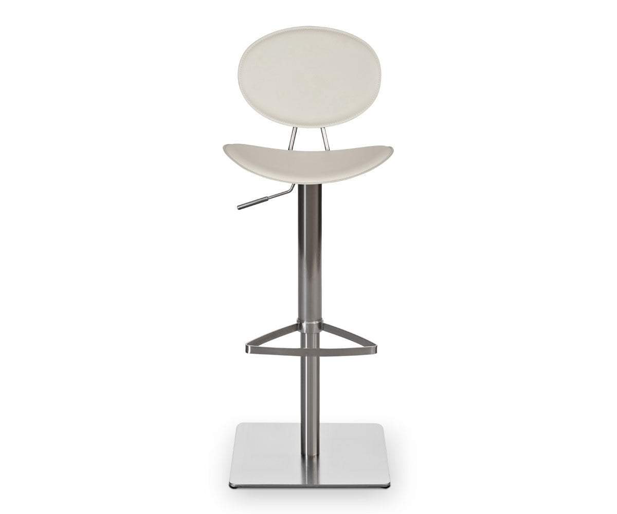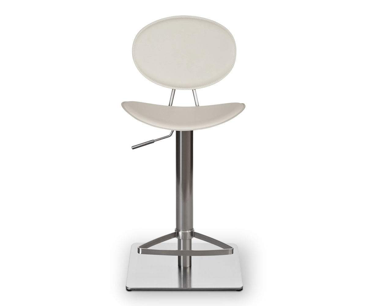 A collage of interesting shapes creates the intriguing design of the Frida adjustable counter and bar stool. The supportive seat and back are tailored in handsome upholstery with a brushed steel base and footrest. This truly contemporary piece blends style from the past with design of tomorrow.