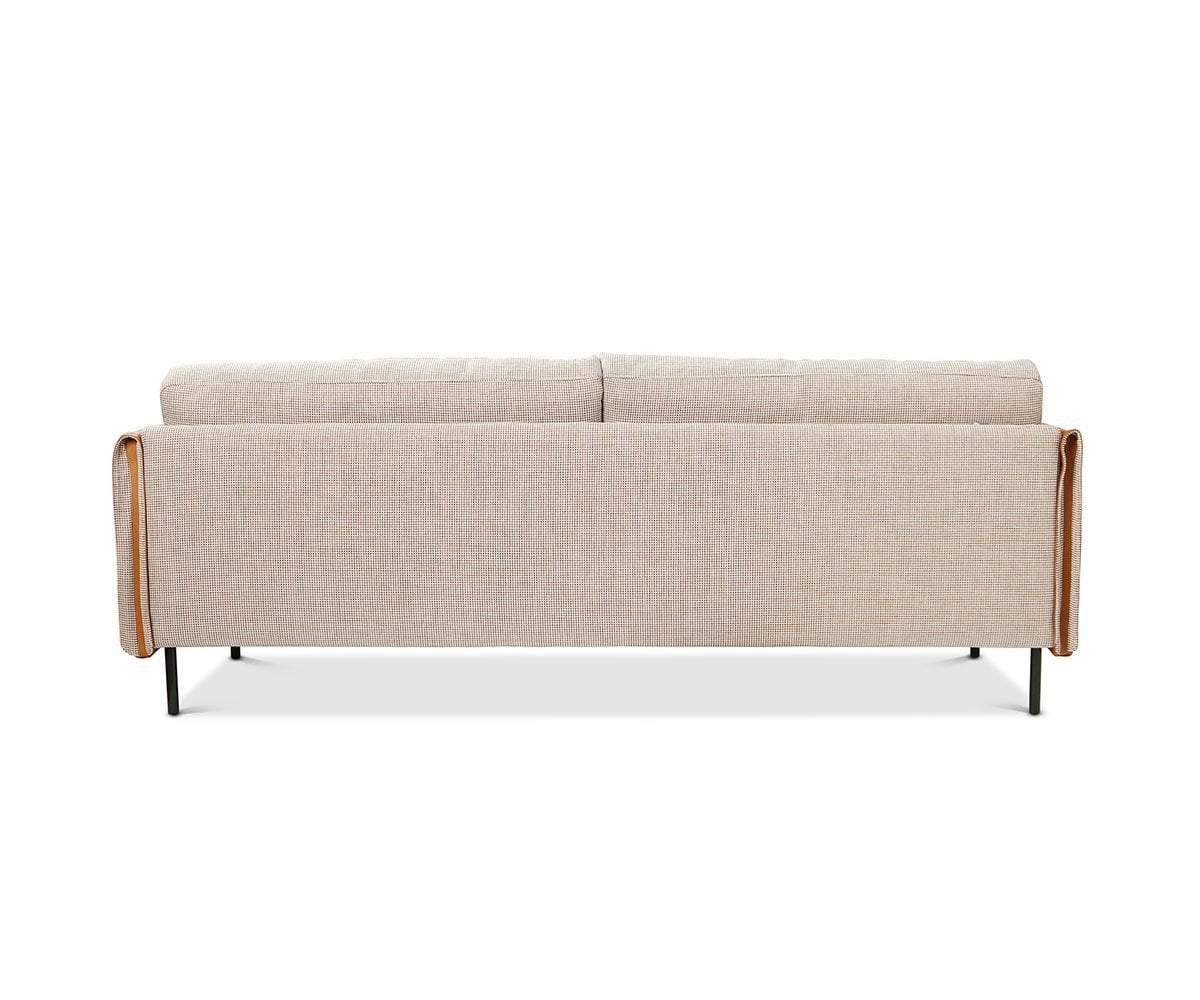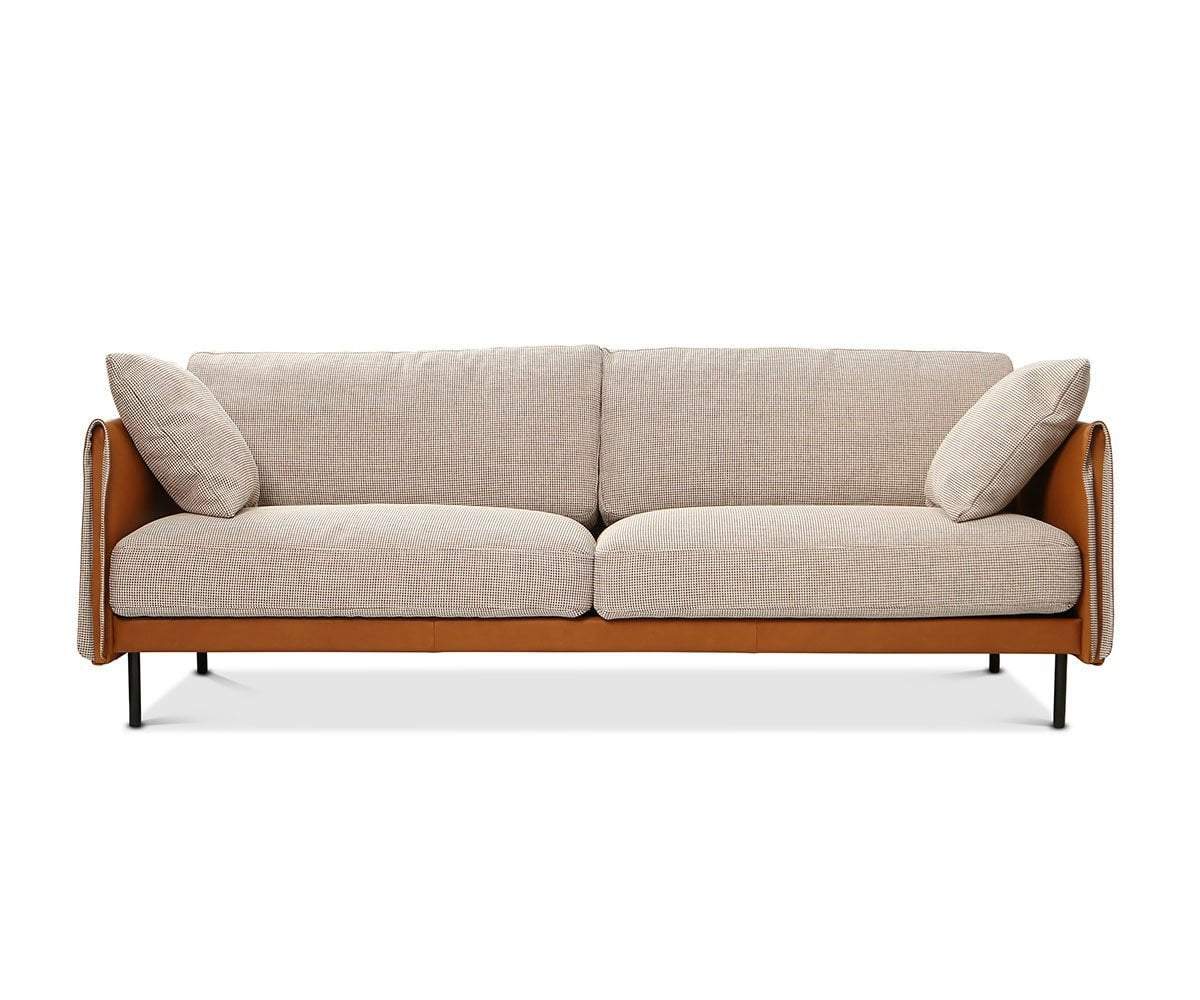 The Glenn sofa stuns with a perfect blend of unique and timeless style. A beautifully textured upholstery combination establishes it as a standout piece for your living or family room. Smooth leather wraps the arms and base, while a gorgeous woven fabric covers the feather blend cushions, pillows and lines the back of the sofa. Its mid-century modern design captivates from top to bottom, as it stands on slim, strong metal legs. Warm tones, graceful lines and comfortable materials make this piece a people pleaser in any space.