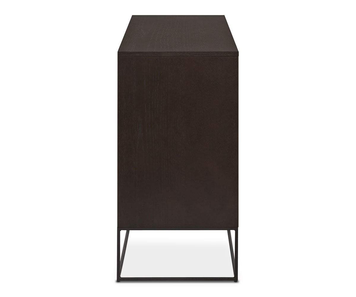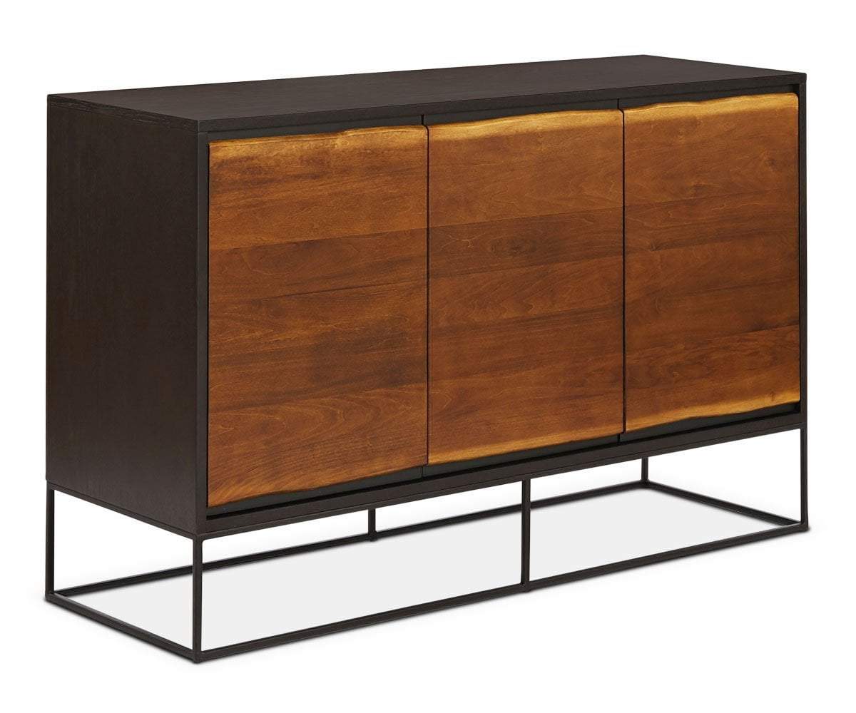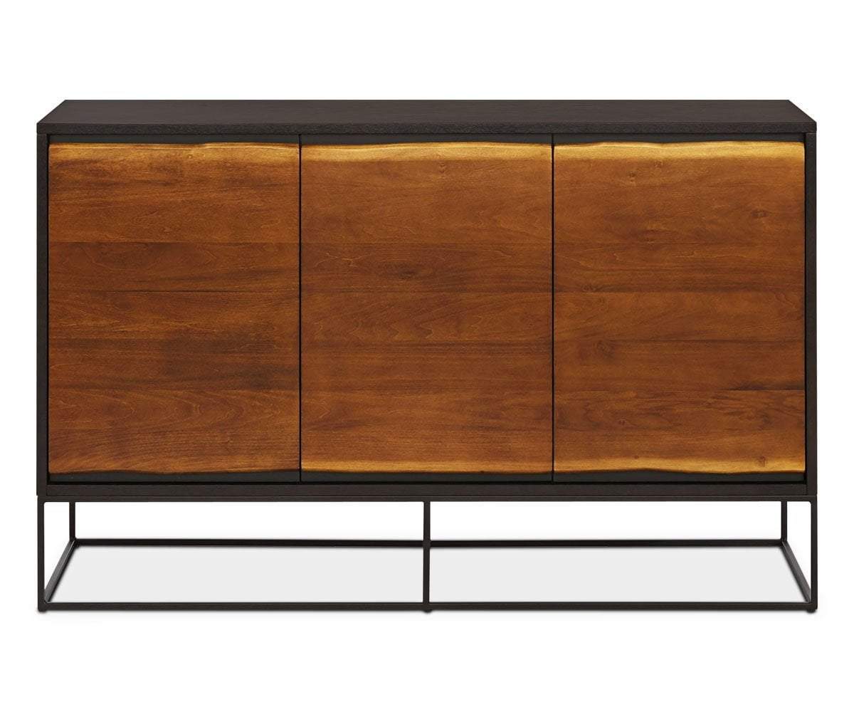 Rustic and modern meet handsomely in the Hasse sideboard. The clean lines of the two-tone cabinet crafted of solid American poplar is complemented by the industrial style black metal base and legs. Three doors open to reveal plenty of storage with a shelf that runs the length of the sideboard. Equip your dining room with a piece that is artfully simple and fully functional.