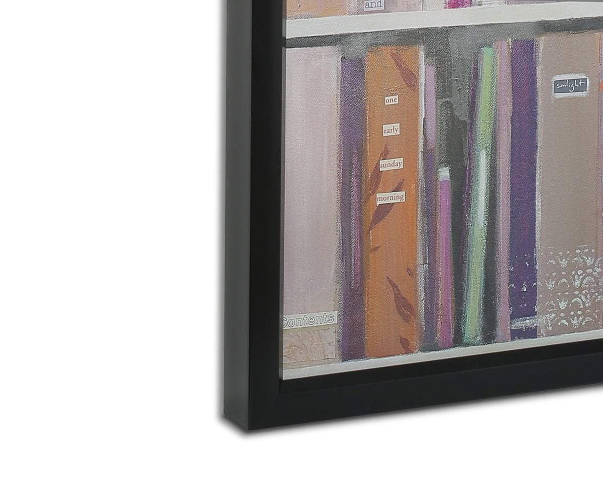 The Introspective Composition evokes the cozy, welcoming feeling of a book-filled room with every glance. A perfect art piece for any bibliophile's wall, it's equally at home in an office, living room or bedroom, and especially fitting for any beloved reading nook. Look closely and see fanciful flowers scattered across those rows of books, adding whimsy to this already charming work of art. It comes beautifully framed and under glass.