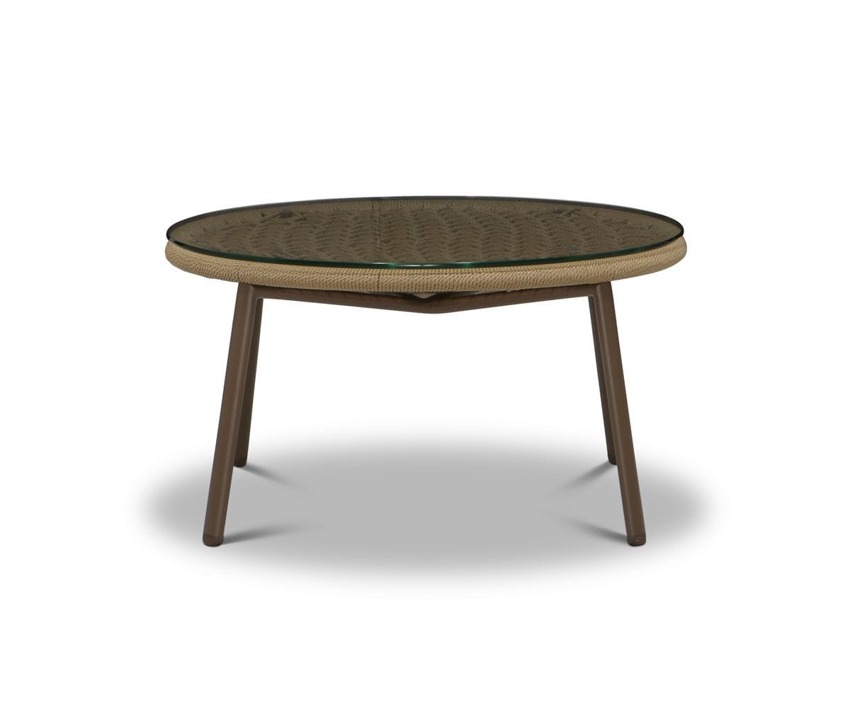 The Inula coffee table blends high-performance and durability with easy coastal vibes. The lightweight aluminum frame is rust-resistant for 24/7 outdoor use, and powder-coated in an earthy taupe color. An 8mm glass table top sits atop woven fiber-rope for a look that evokes seaside relaxation.