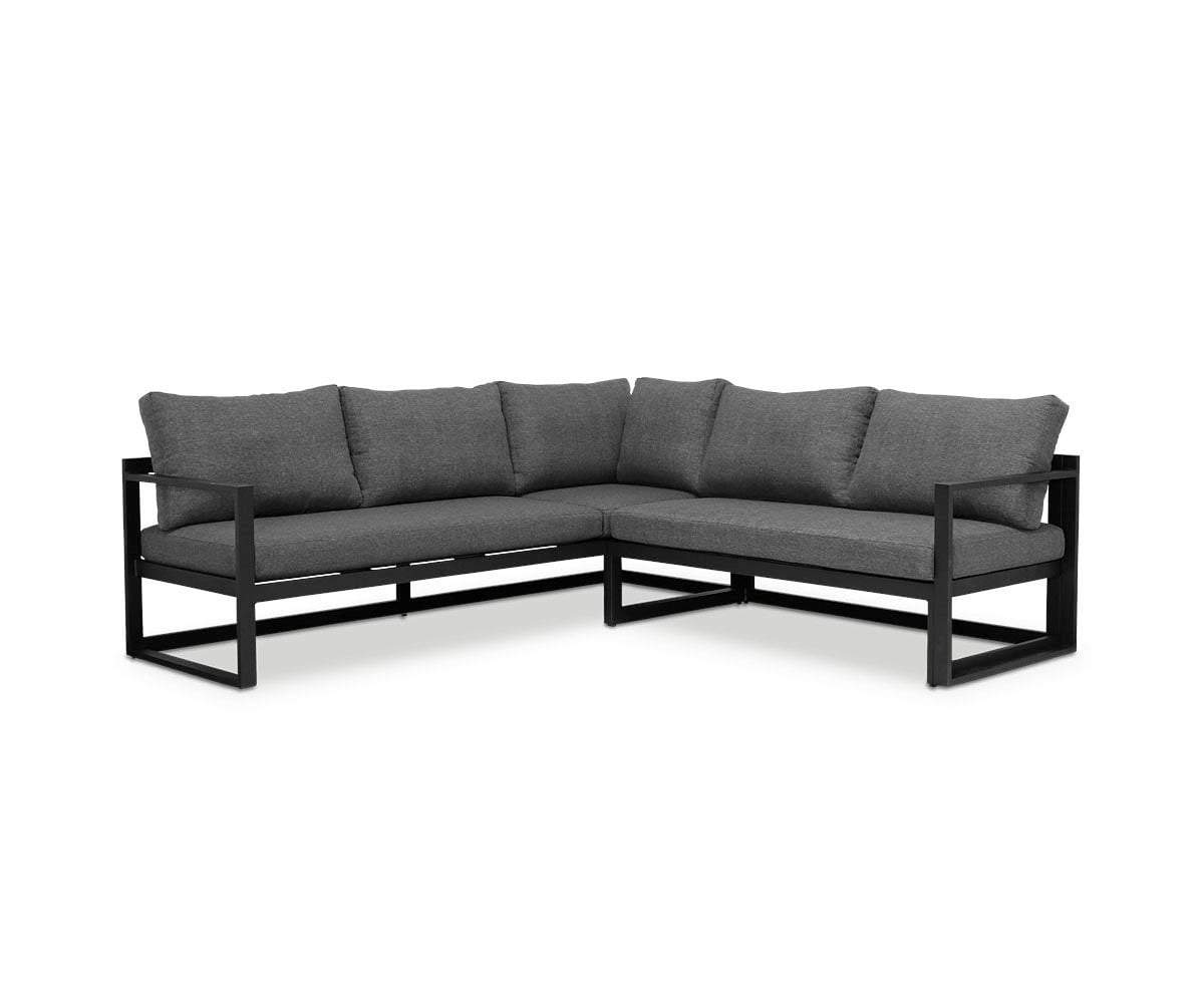 The Jaren sectional with coffee table is comfortable, contemporary and to-the-point with its clean lines. The open, airy frame features dynamic 90-degree angles and is made with aluminum that has been treated for all-weather durability. The sleek coffee table is made with a tempered and tinted glass top. Plush cushions are enveloped with water-repellent and UV-resistant covers for long-lasting beauty and minimal maintenance.