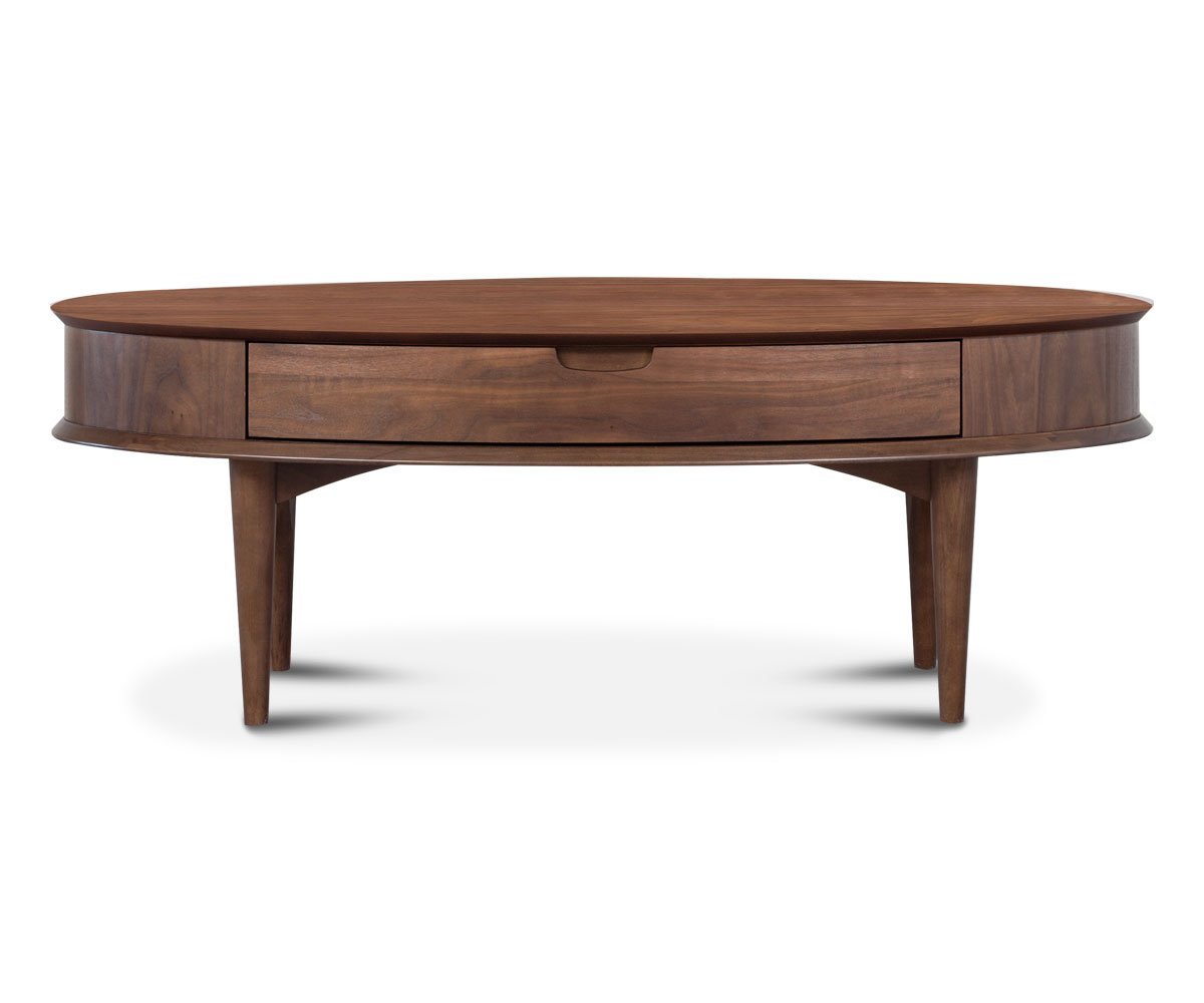 Our Juneau coffee table has a light, mid-century look with splayed tapered legs. Constructed from solid wood, this understated, classic design features a single, large drawer constructed with French dove tail joints.