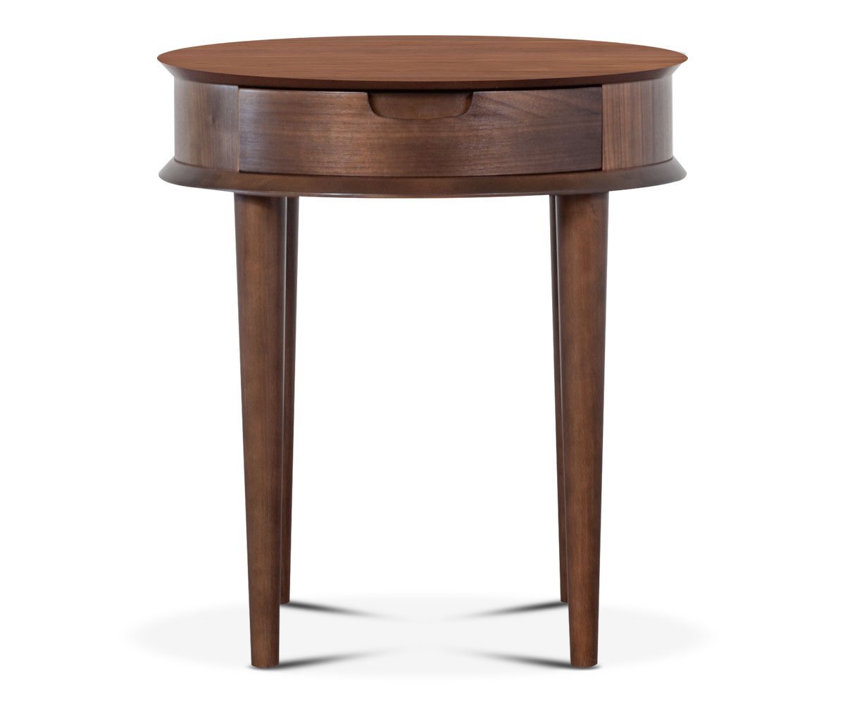 Infused with subtle mid-century style, the Juneau end table is the perfect piece to give your living room a pulled-together look. Features an eye-catching round shape, long tapered legs, and a single drawer with French dove-tail joints.