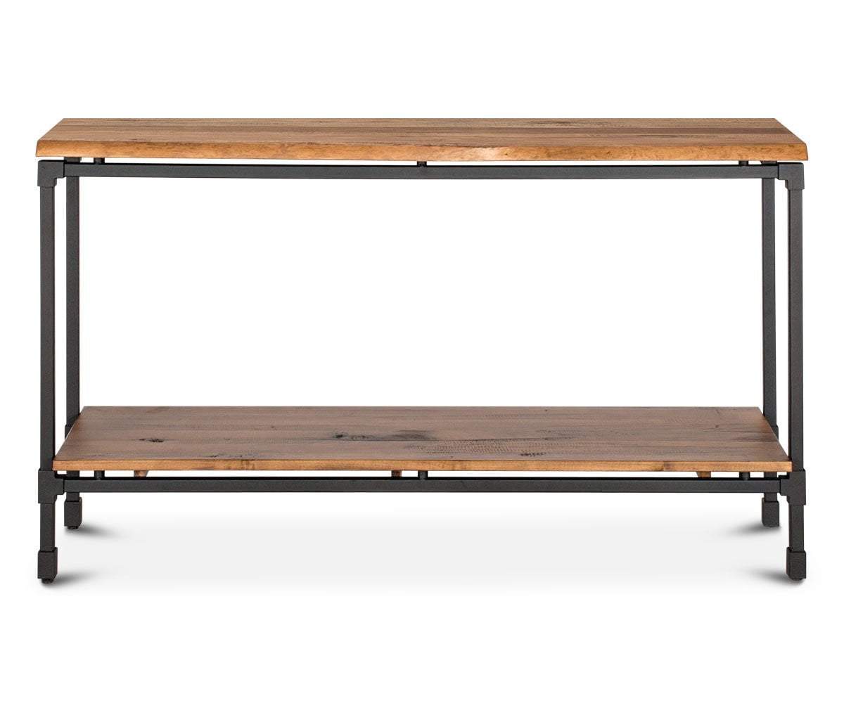 The Karsten console table offers versatile and charming style with rustic industrial materials. Crafted from natural poplar and powder-coated iron, it boasts a large profile and open design with ample space for storage or display.