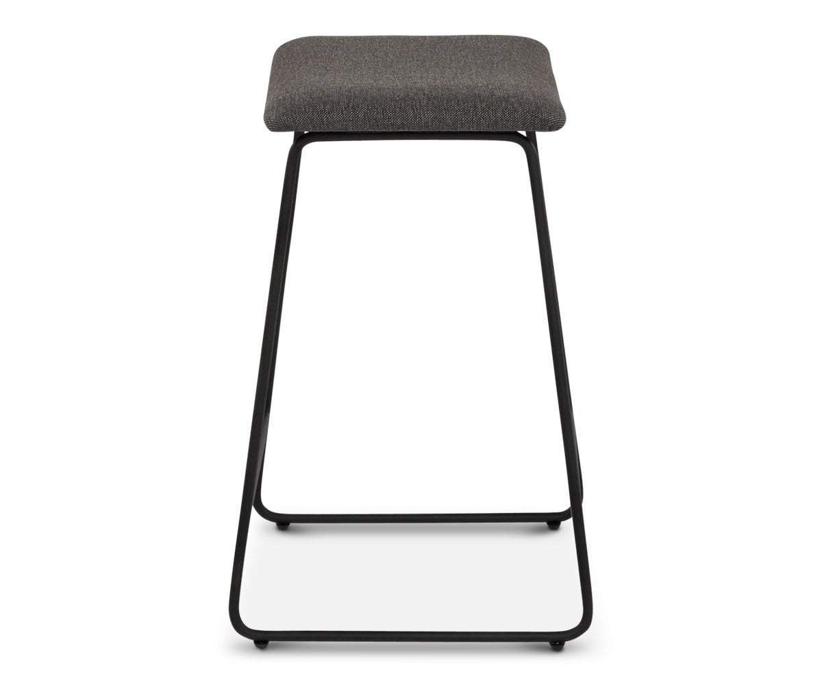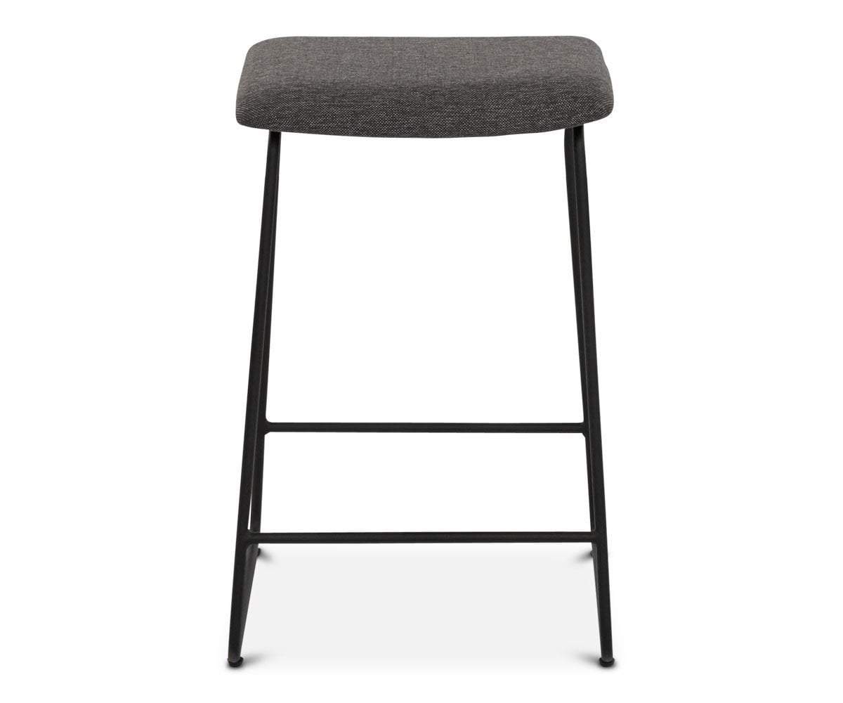 Modern minimalism is in true form in the rustic industrial Karsten counter stool. Sleek black metal shapes the connected base. A cushioned seat is treated to neutral upholstery adding texture. A footrest bar ensures leg comfort.