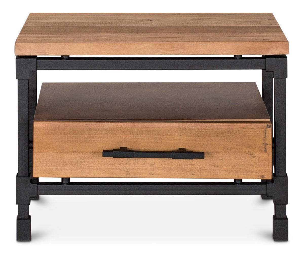 Complete your rustic industrial bedroom set with the Karsten nightstand. This stout, masculine design boasts a large surface area and a small drawer for keeping clutter at bay. Crafted from solid American poplar wood and powder-coated metal.