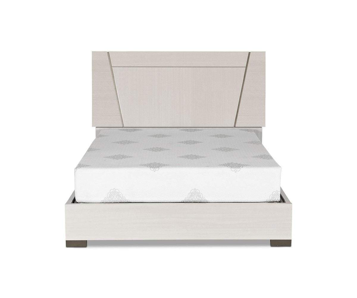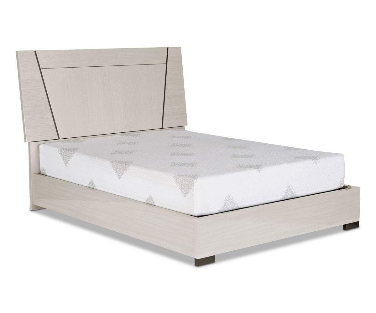 Elegant angles define the Monchiaro bed and create an instant focal point in your bedroom. The platform style bed and high headboard are constructed of a high-gloss, light grey koto wood veneer that will transform you room into an elegant oasis.Queen bed pictured.