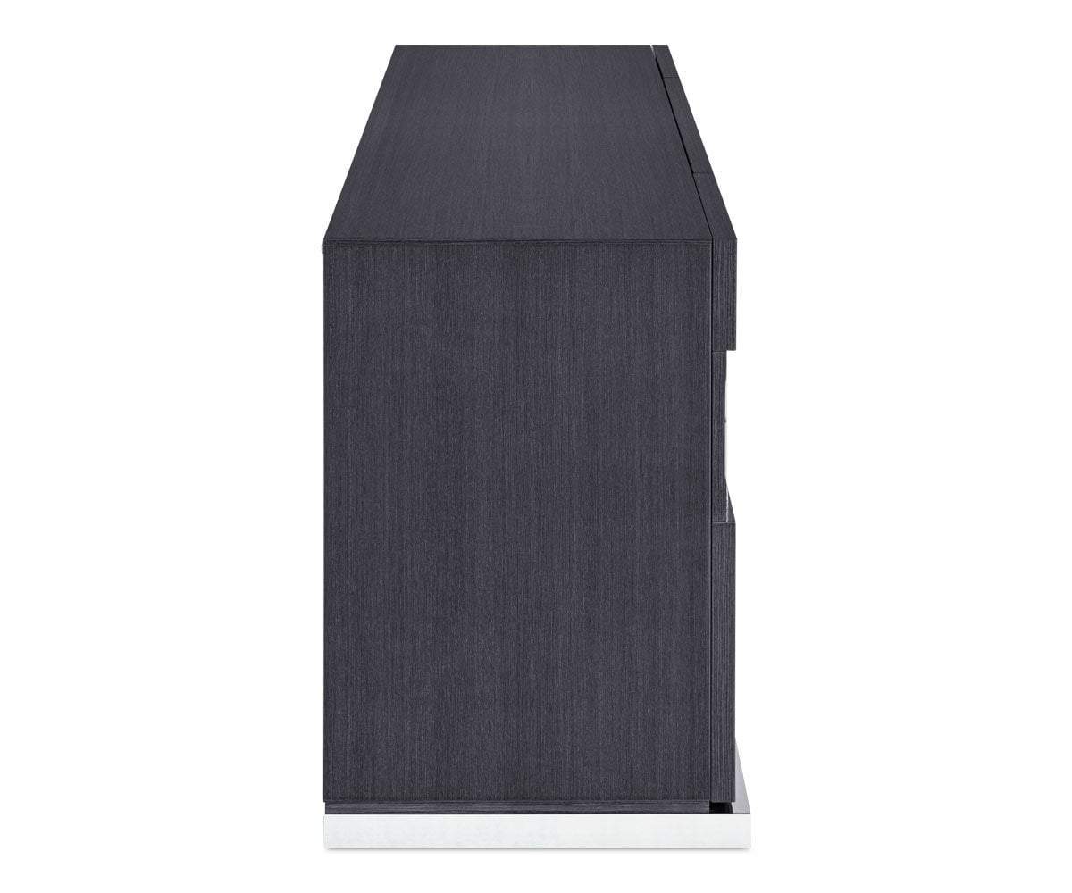 Crafted with roomy cabinets and drawers, the Mondiana credenza is a storage piece and a work of art. Chrome accents and a high-gloss koto veneer finish give this credenza a chic, modern aesthetic. Two large file drawers accommodate letter and legal size files. Two large cabinets provide extra space.